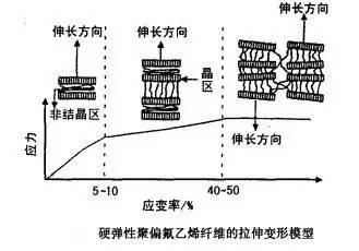 上述彈性纖維都屬軟彈性纖維,在較低應(yīng)力下就發(fā)生較大的變形和回復(fù)。從熱力學(xué)角度分析,彈性來自分子鏈的自由度(或混亂度),即體系熵值的變化,因此上述纖維的結(jié)晶度都很低。但是在特殊加工條件下制得的某些纖維,例如聚丙烯(PP) 、聚乙烯(PE)等纖維,雖然在低應(yīng)力下不易變形(因?yàn)樗鼈冇休^高的模量),但在較高應(yīng)力下,特別是在較低溫度下,也有較好的彈性,故這類纖維被稱為硬彈性纖維。